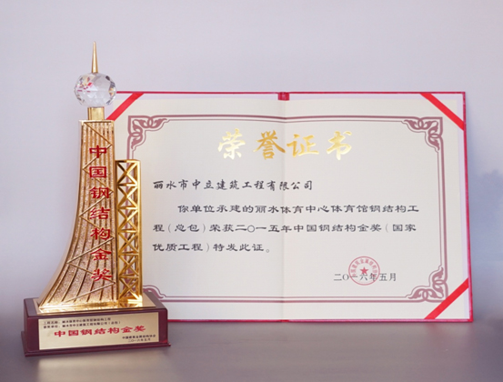 2016年5月,麗水市中立建筑工程有限公司總承包的麗水市體育中心體育館建設(shè)工程榮獲由中國(guó)建筑金屬結(jié)構(gòu)協(xié)會(huì)建筑鋼結(jié)構(gòu)分會(huì)頒發(fā)的“中國(guó)鋼結(jié)構(gòu)金獎(jiǎng)”。成為麗水市首個(gè)獲得此項(xiàng)殊榮的工程。